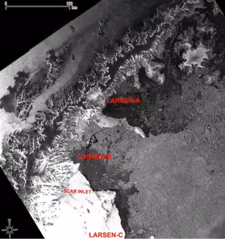 La barrera de hielo Larsen está compuesta por tres secciones --Larsen A (la más pequeña), B y C (la mayor)-- que se extienden de norte a sur a lo largo del litoral oriental de la península Antártica. Larsen A se desintegró en enero de 1995, mientras que Larsen C ha mantenido una extensión más o menos estable. Sin embargo, las medidas realizadas con la ayuda de los satélites desvelan que está perdiendo espesor y que la duración del deshielo estival no ha dejado de aumentar.