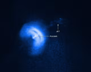 Como consecuencia de este rápido movimiento, el púlsar azota la materia que se encuentra a su alrededor y escupe un chorro de partículas cargadas que salen disparadas a lo largo del eje de rotación del púlsar.