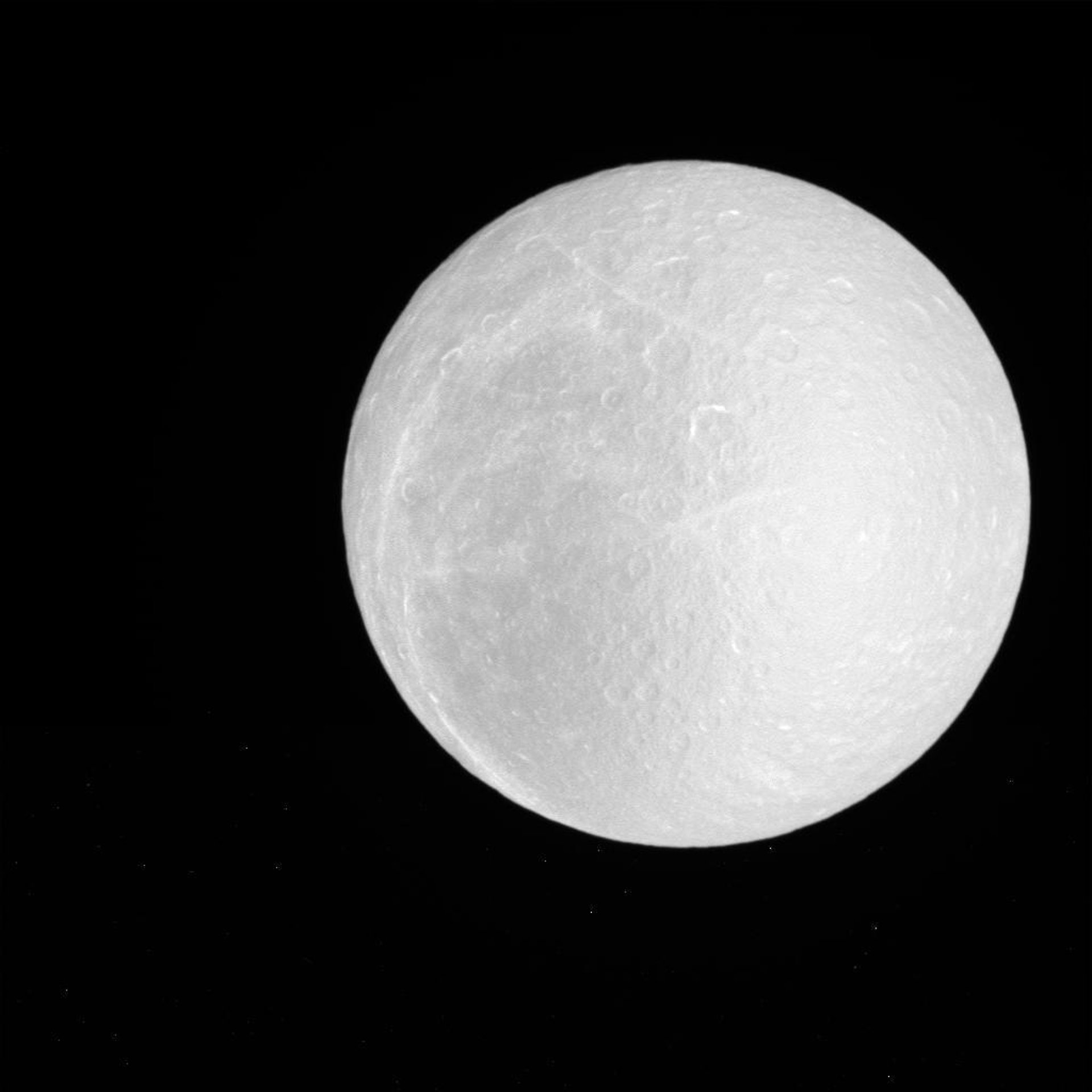 El reciente sobrevuelo más cercano a la luna de Saturno Rea protagonizado por la sonda Cassini, ha proporcinado una imagen con detalle sin precedentes que describe una superficie brillante con una fractura marcada en un terreno estriado de unos 14.000 kilómetros.