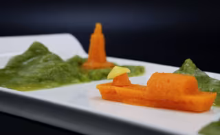 Un 'paisaje alimentario' ensamblado con diseños impresos en 3D hechos de guisantes, zanahorias y maíz.