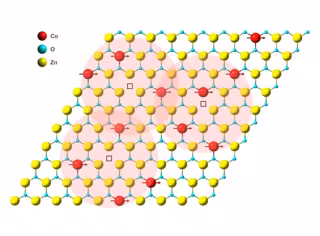 Ilustración de acoplamiento magnético en una monocapa de óxido de zinc dopado con cobalto. Las esferas roja, azul y amarilla representan átomos de cobalto, oxígeno y zinc, respectivamente. - BERKELEY LAB