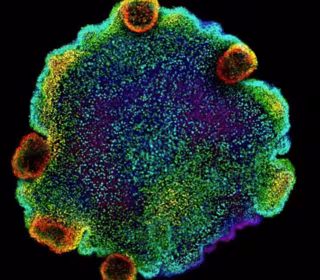 Imagen de microscopía confocal de núcleos, coloreados según la profundidad, de Trichoplax sp. H2, una de las cuatro especies de placozoos para las que los autores del estudio crearon un atlas celular - SEBASTIAN R. NAJLE