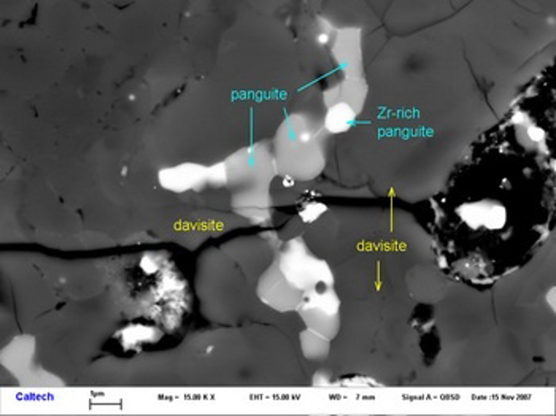 El 'Panguite' fue observado por primera vez bajo un microscopio electrónico de barrido en una incrustación del meteorito conocida como incrustación refractaria, que se cree son los primeros materiales planetarios formados en nuestro Sistema solar, anteriores a la formación de la Tierra y otros planetas.