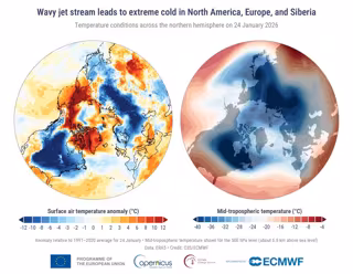 Estas son algunas de las conclusiones principales del balance de enero del Servicio de Cambio Climático de Copernicus (C3S) implementado por el Centro Europeo de Previsiones Meteorológicas a Plazo Medio (CEPMPM), publicado este martes. En él, el organismo ha advertido que el inicio del año ha venido marcado por fenómenos meteorológicos extremos en ambos hemisferios. Por un lado, el hemisferio norte experimentó fuertes olas de frío debido a que una corriente en chorro polar serpenteante derramó aire gélido sobre Europa y Norteamérica.