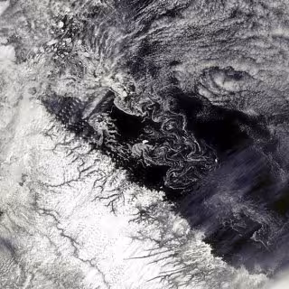 Los témpanos de hielo que aparecen en la parte superior de la imagen son visibles hacia el sur, a la deriva en el mar. Los remolinos blancos indican la deriva de los pequeños trozos de hielo en respuesta a vórtices marinos, o "remolinos", y son una expresión de las corrientes superficiales del océano.