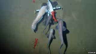 Estos peces se mezclan con gambas grandes y brillantes de color rojo. Además, se han descubierto varias especies de anguilas y miles de crustáceos pequeños, algunos de los cuales fueron recogidos y llevados de vuelta a la superficie.