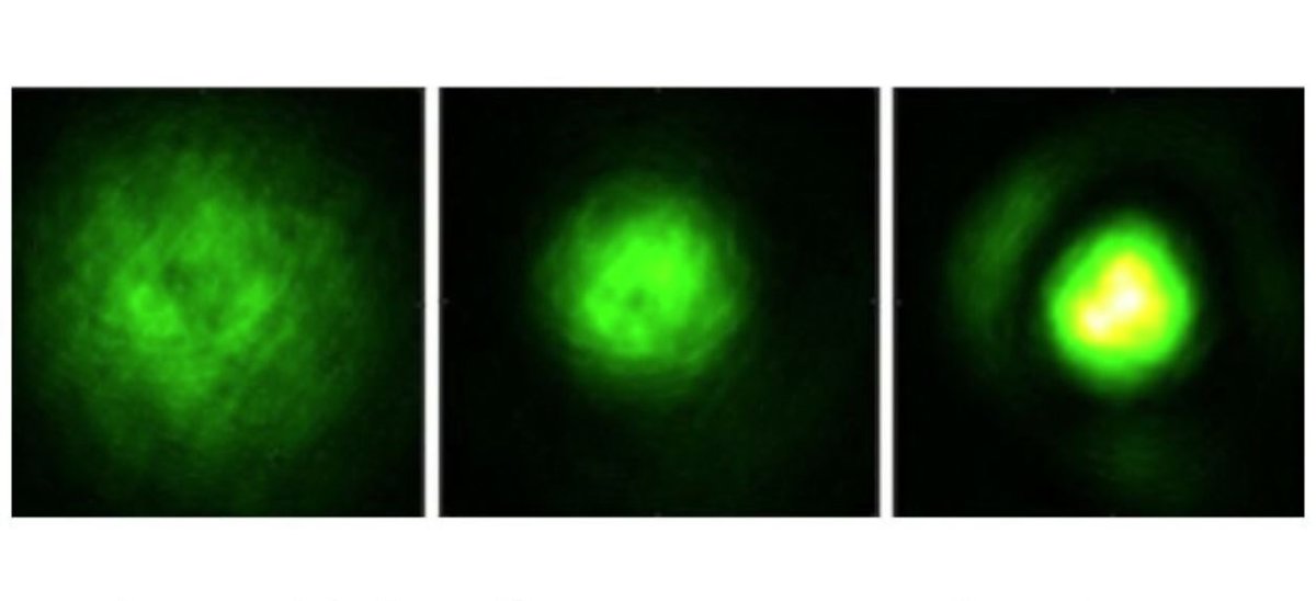 Un haz de láser verde en una onda continua no guiada (izquierda) y el mismo hac guiado por una onda de guía de air4e generada a 10 hertzios (Centro) y a 1.000 hertzios (derecha). La onda de aire a la derecha está esencialmente operando de forma continua. - UNIVERSIDAD DE MARYLAND