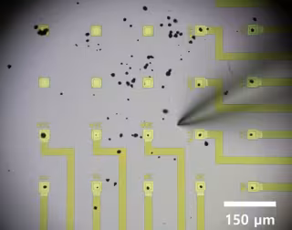 Cada matriz es un chip de 2 por 2 centímetros diseñado a medida con hasta 100 microelectrodos. Después de dispersar algunas partículas de cátodo en el centro del chip, Min movió partículas individuales a sus propios electrodos en la matriz usando una aguja alrededor de 70 veces más delgada que un cabello humano. Una vez que las partículas estaban en su lugar, Min podía cargar y descargar simultáneamente hasta cuatro partículas individuales a la vez en la matriz y midió 21 partículas en este estudio en particular.