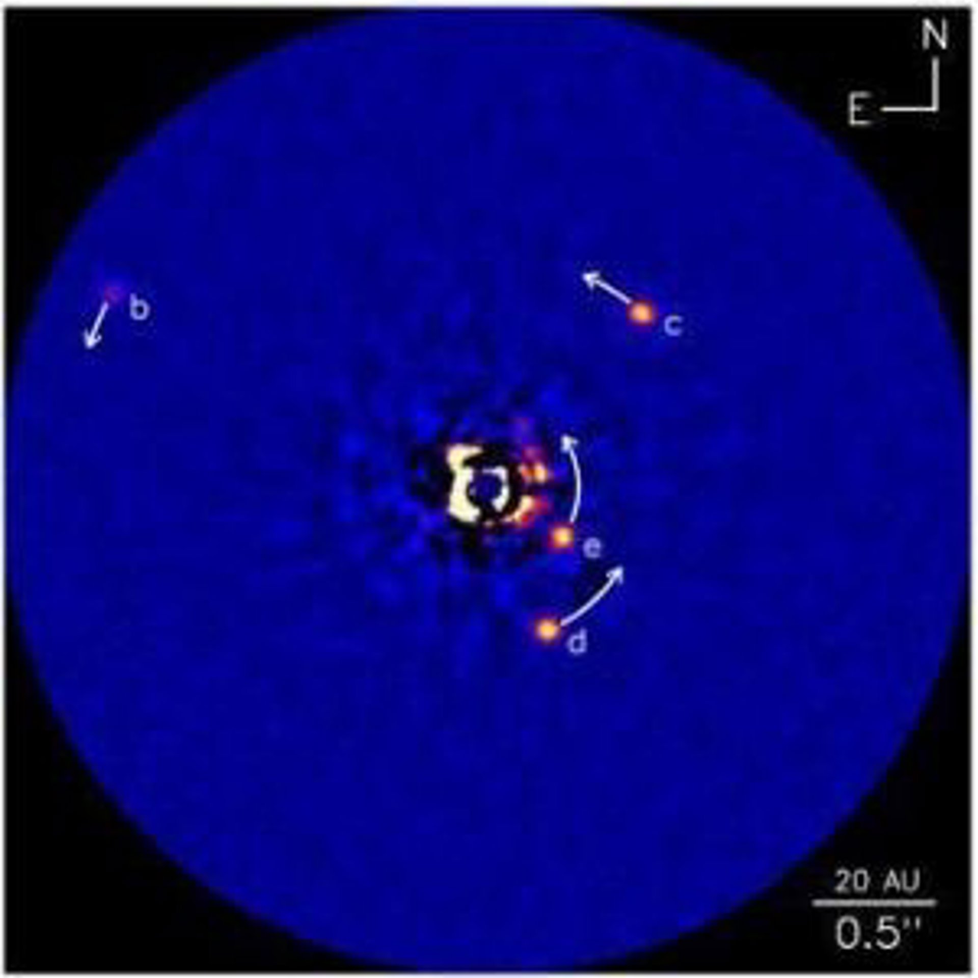 El planeta recién descubierto (conocido como HR 8799e) mediante el telescopio Keck de Hawaii, orbita una estrella brillante llamada HR 8799, que se encuentra a unos 129 años luz de la Tierra y es apenas visible a simple vista. La masa del sistema planetario de HR 8799 es mucho mayor que la nuestra. Los astrónomos estiman que la masa combinada de los cuatro planetas gigantes puede ser 20 veces mayor que la masa de todos los planetas de nuestro sistema solar, y los cinturones de desechos también contienen mucha más masa que los nuestros.