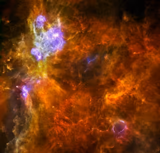 En la imagen se puede ver como brillantes nudos azules de polvo caliente, que marcan la formación de estrellas masivas, dominan la parte superior izquierda de la imagen en las dos regiones más jóvenes de la escena. Del mismo modo, se ven las estrellas de gran masa en la parte inferior.