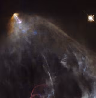 Estos chorros son disparados a una velocidad de varios cientos de kilómetros por segundo y chocan violentamente con grupos cercanos de polvo y gas, creando estructuras tenues y ondulantes conocidas como objetos Herbig-Haro, como el HH 151 visto en la imagen.