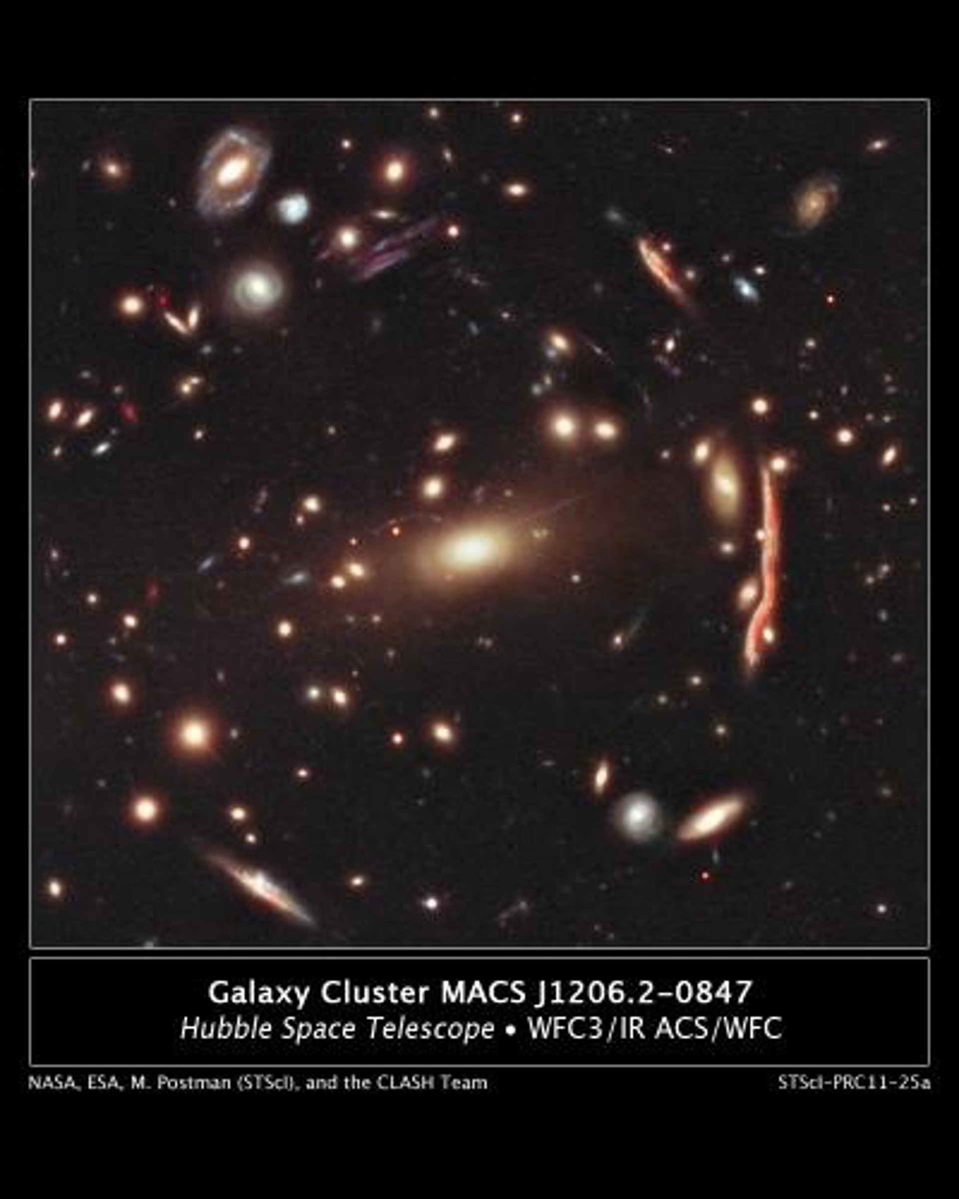 MACS 1206 se encuentra a 4.000 millones de años luz de la Tierra. La aguda visión del Hubble ayudó a los astrónomos de CLASH a descubrir 47 imágenes múltiples de 12 galaxias lejanas recién identificadas. Encontrar tantas imágenes múltiples en un cúmulo es una capacidad única de Hubble y la encuesta CLASH está optimizada para encontrarlas. Las nuevas observaciones se basan en trabajos anteriores del Hubble y de telescopios terrestres.