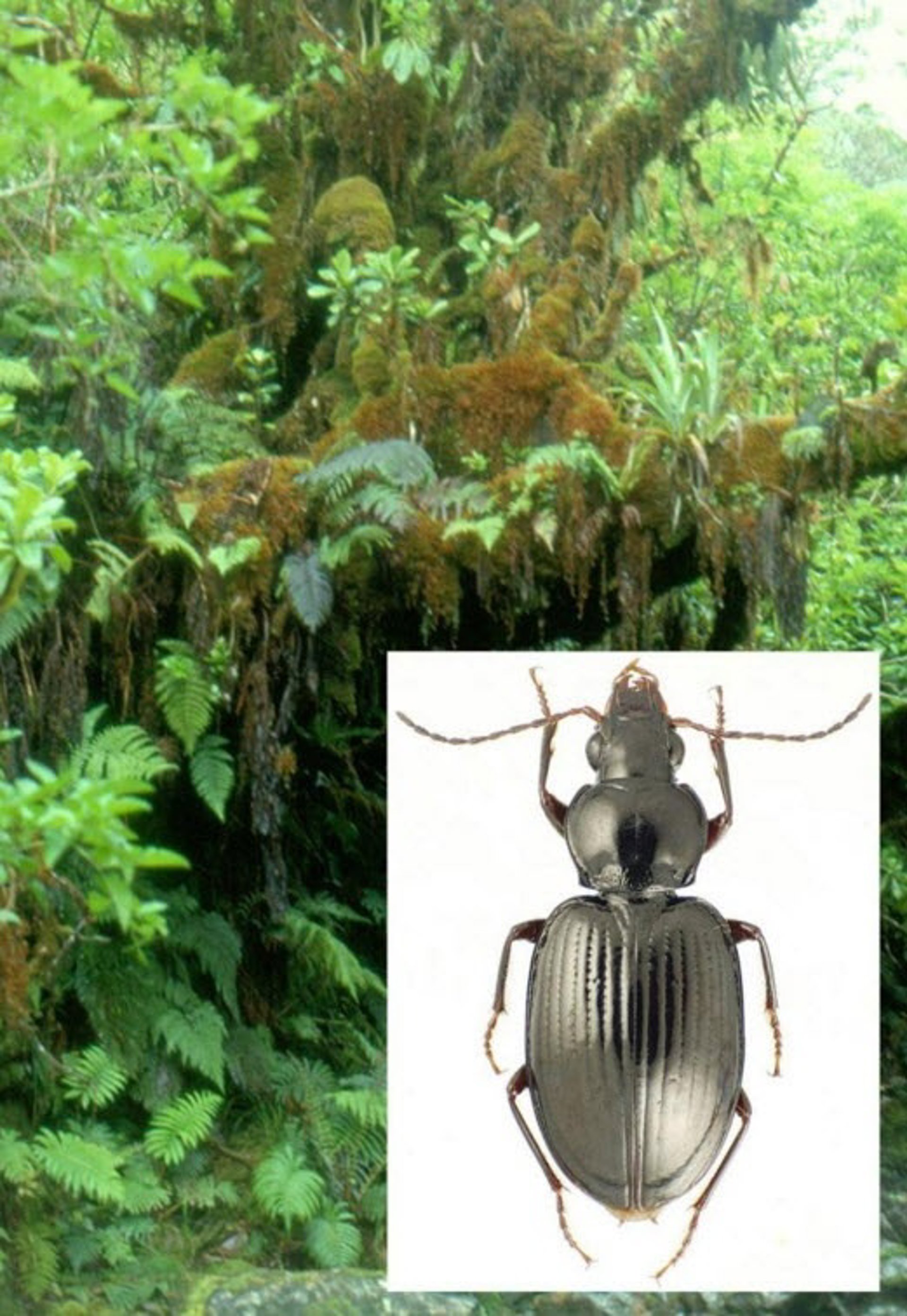 Hay un total de 116 especies de escarabajos conocidos que habitan sobre los 1.440 kilómetros cuadrados de superficie del volcán. También se descubrieron diversos microhábitats que contienen especies únicas de escarabajos Mecyclothorax, que viven en estrecha colaboración. El escarabajo Mecyclothorax rex es descrito en la imagen en un recuadro sobre su hábitat preferido - la alfombra de musgo en un árbol de ohia.