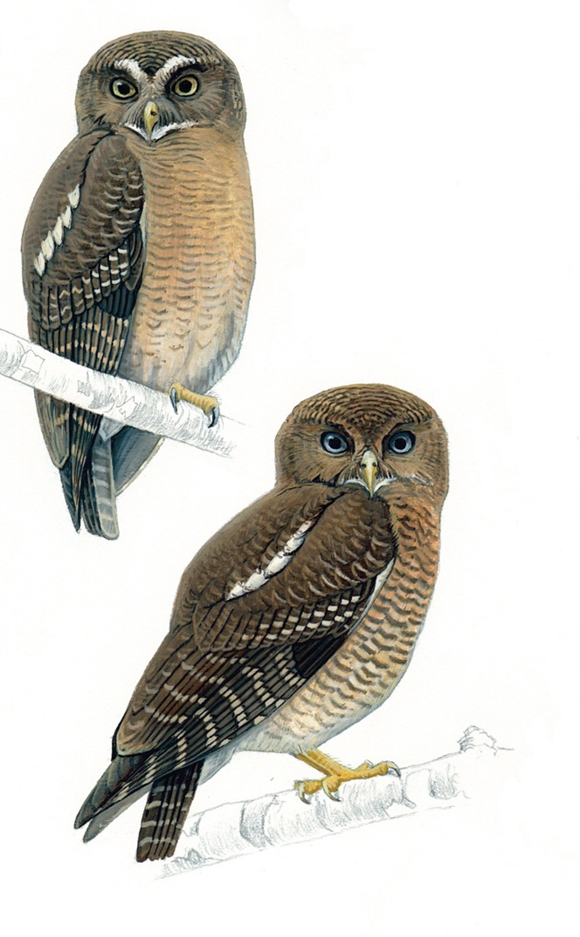 El primer búho, el halcón-búho Camiguin (abajo en la imagen), sólo se encuentra en la pequeña isla de Camiguin Sur, cerca del norte de Mindanao. A pesar de estar tan cerca geográficamente a los búhos relacionados en Mindanao, tiene características físicas muy diferentes y también su voz. Por la noche, emite una canción en solitario que crece en intensidad, con una distintiva voz baja gruñona. Las parejas de búhos dan cortos duetos que se inician con un gruñido. También son los únicos búhos que tienen ojos azules-grises.