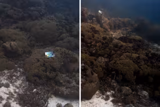 SeaSplat, una nueva herramienta de corrección de color, reconstruye los colores reales de una imagen submarina tomada en Curazao. La foto original está a la izquierda y la versión corregida con SeaSplat, a la derecha. - MIT