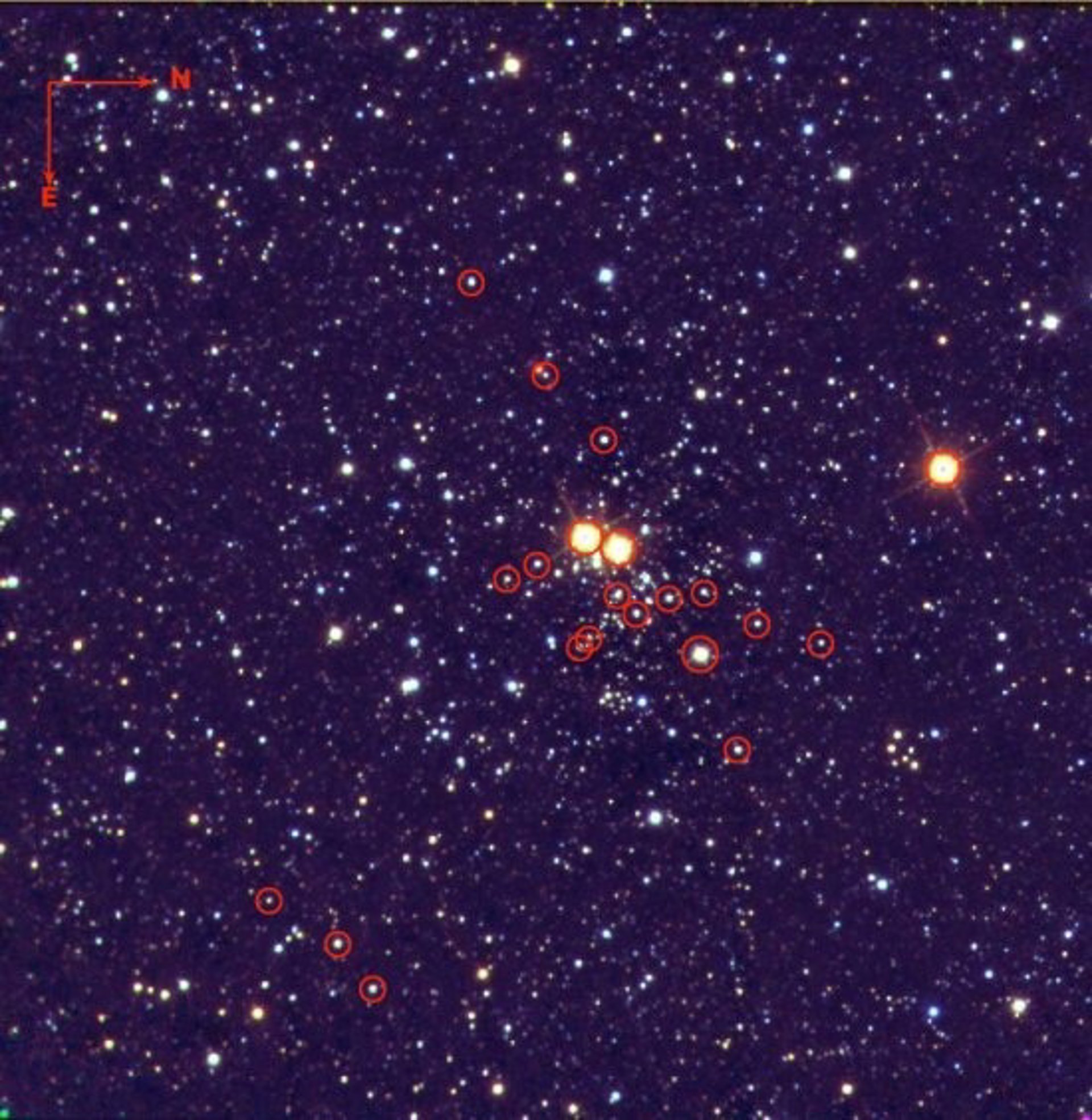 En la imagen adjunta se muestra el cúmulo estelar. Con círculos rojos se han marcado las estrellas masivas clasificadas por los astrofísicos.