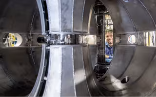 Esta vista del interior de LTX-beta muestra cómo se ve el dispositivo de contención de plasma en forma de rosquilla después de que se haya limpiado el litio de las paredes de la carcasa y se hayan abierto varios puertos. - ELLE STARKMAN/PPPL