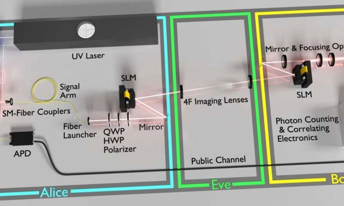 Supongamos que Alice quiere enviar un mensaje cifrado a Bob. Ella utiliza la máquina para generar fotones que viajan a través del espacio libre y en un modulador espacial de luz (SLM) que altera las propiedades de los fotones individuales (por ejemplo, la amplitud, la inclinación) para codificar correctamente los mensajes en los frentes de onda planos pero inclinados que se pueden enfocar a puntos únicos dictados por la inclinación. Pero el SLM hace una cosa más: distorsiona las formas de los fotones en patrones al azar, de forma que los frentes de onda no sean planos, lo que significa que no tienen un enfoque bien definido.