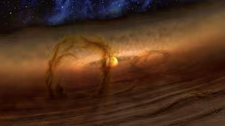 Las estrellas nacen del colapso en enormes nubes de gas y polvo, que giran a medida que se reducen por debajo de la fuerza de la gravedad. A medida que una estrella crece en tamaño, se desprenden más materiales desde la nube y la rotación aplana este material hasta terminar en un disco turbulento. En última instancia, los planetas se agrupan a partir del material del disco .