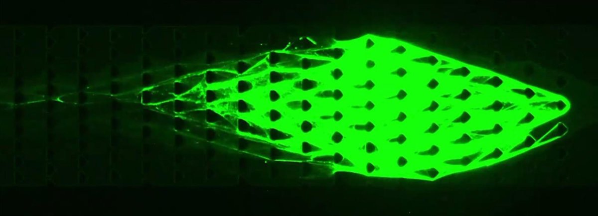 A medida que el flujo invadía el material, el ADN sintetizaba sus propias nuevas hebras, con el extremo frontal del material creciendo y el extremo de la cola degradándose en un equilibrio optimizado. De esta manera, hizo su propia locomoción, avanzando lentamente, contra el flujo, de manera similar a como se mueven los mhos del fango.