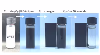 En el estudio dirigido por Toma, se sintetizaron nanopartículas magnéticas de óxido de hierro (II, III), u óxido de hierro negro (Fe3O4), mediante coprecipitación y luego se recubrieron con polidopamina (PDA) oxidando parcialmente la dopamina en una solución ligeramente alcalina para formar Fe3O4@PDA. La lipasa se inmovilizó en este sustrato. Se utilizó microscopía Raman hiperespectral para controlar el secuestro y la degradación del plástico en tiempo real.
