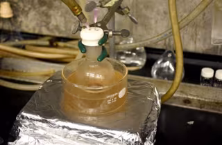 Un matraz lleno de ceras generadas a partir de residuos de polietileno y polipropileno se calienta en un baño de aceite y las ceras se oxidan mediante una corriente de aire para producir ácidos grasos mediante oxidación catalítica. - STEVEN MACKAY/ VIRGINIA TECH.