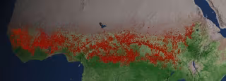 Durante la temporada de quemas, que abarca en promedio entre julio y septiembre de 2006, las visualizaciones muestran un enorme brote de incendios en la sabana de África Central impulsado principalmente por las actividades agrícolas, pero también por la caída de rayos.