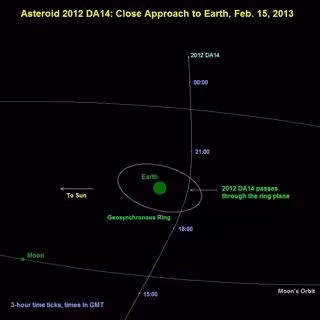 A pesar de que su tamaño no está bien determinado, se cree que este asteroide cercano a la Tierra tiene unos 45 metros de diámetro. El asteroide 2012 DA14 pasará por el interior del anillo de satélites geoestacionarios, situado a unos 35.800 kilometros por encima del ecuador.