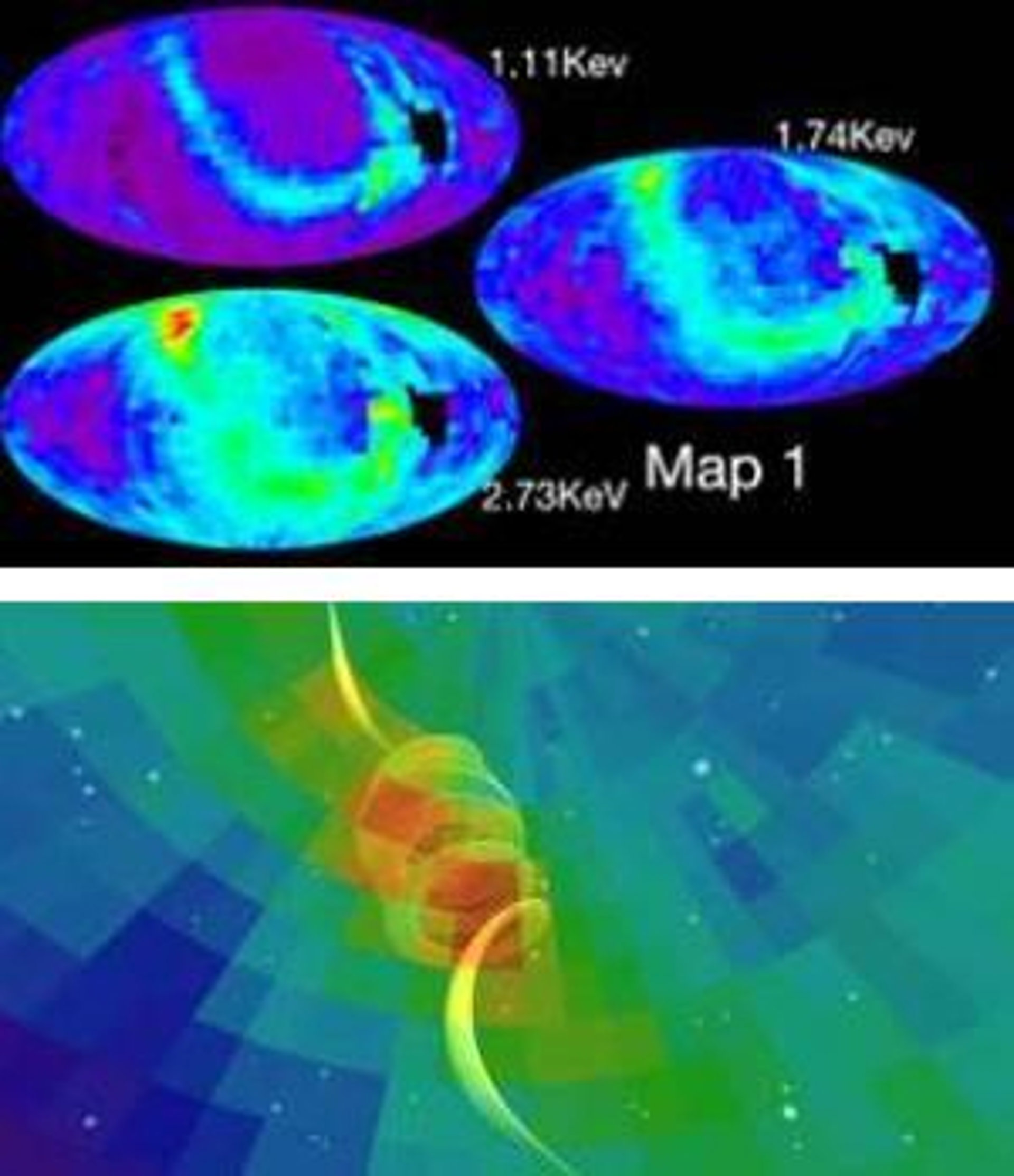 Mientras, en el segundo mapa, que acaba de publicarse, se muestra la estructura a gran escala de la cinta que, en general se mantiene estable al cabo de seis meses, los cambios también son evidentes . Las regiones polares de las emisiones de la pantalla de la cinta inferior y el nudo disminuyen hasta en un tercio y parecen "desatarse", ya que se extiende tanto a las latitudes inferiores y superiores .