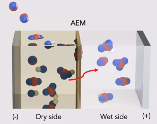 En el lado seco, un solvente orgánico se adhiere al dióxido de carbono disponible para producir una concentración de bicarbonato o bicarbonato de sodio en la membrana. A medida que se acumula el bicarbonato, estos iones cargados negativamente atraviesan la membrana hacia un electrodo cargado positivamente en una solución a base de agua en el lado húmedo de la membrana. La solución líquida disuelve el bicarbonato en dióxido de carbono, por lo que puede liberarse y aprovecharse para combustible u otros usos.