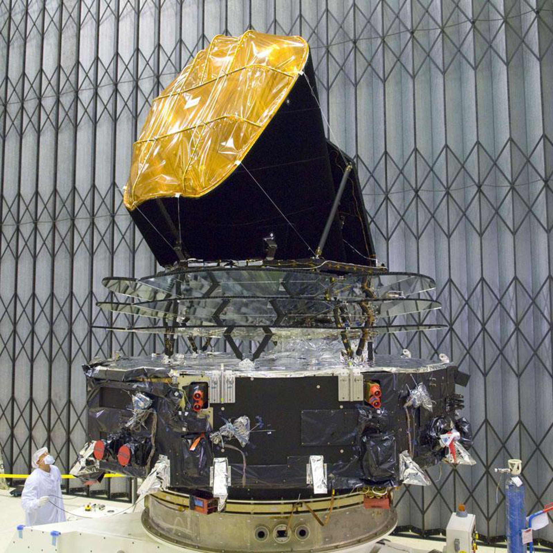 "Planck (en la imagen antes de su lanzamiento) está activo tomando ya datos a través de sus nueve canales de frecuencia. En dos semanas se conformarán los primeros mapas de muestreo pero los datos científicos importantes aparecerán el próximo año, los primeros logros de la cosmología", comentó, al tiempo que aseguró que todo "parece ir bien" y con resultados "apasionantes", que todavía no se pueden desvelar.