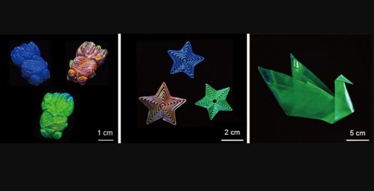 A continuación, imprimieron en 3D esta formulación líquida en diversas formas que se moldearon en pequeñas estructuras, se formaron en una película delgada y se doblaron suavemente para formar molinetes y grullas de origami.
