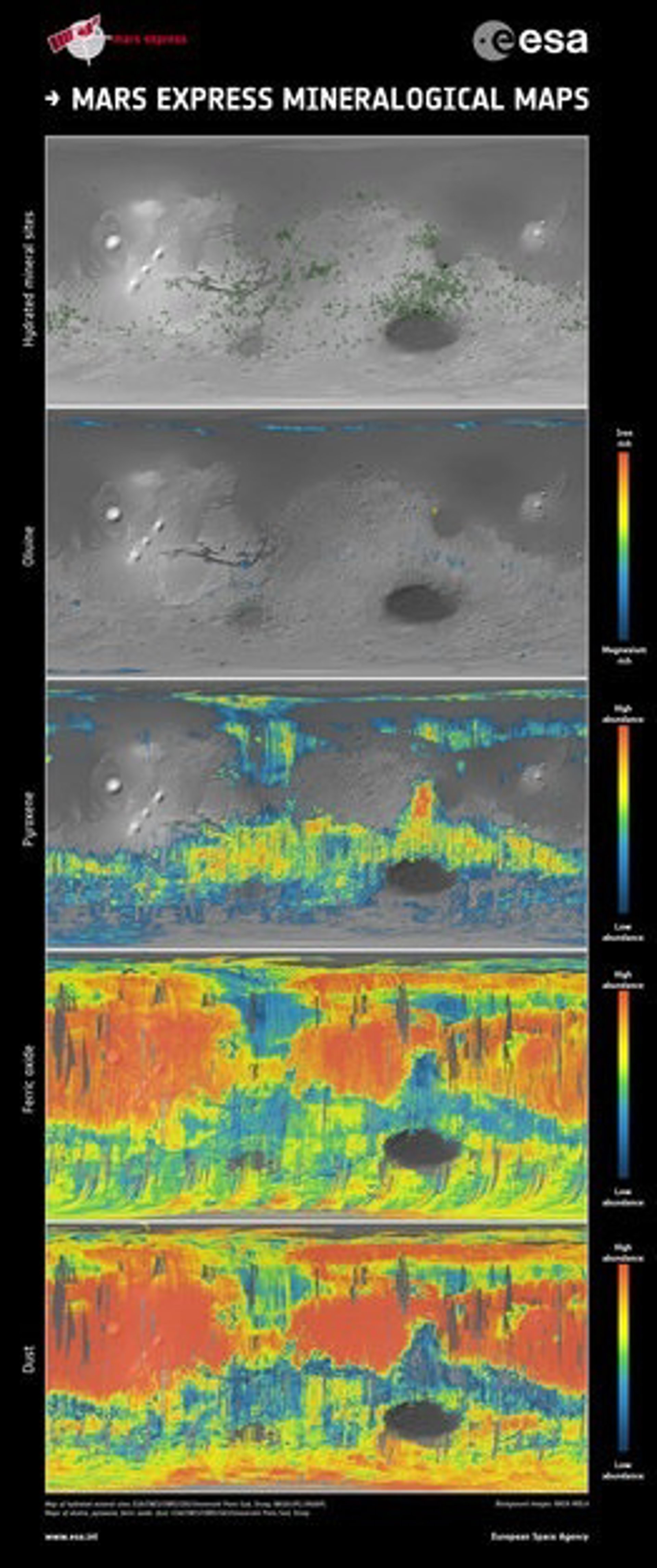 Los siguientes dos mapas, que muestran los minerales olivina y piroxeno, revelan la historia del vulcanismo en Marte. Las diferencias en la composición química de las capas de lava dan pistas sobre cómo han evolucionado la temperatura y la presión en el interior del planeta. La olivina y el piroxeno son minerales que se forman cuando la lava se solidifica. El basalto está presente en la corteza de Marte, así como en la corteza oceánica en la Tierra y en los mares volcánicos de Marte.