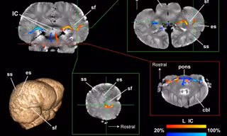 Los datos de los escaneos DTI permitieron a los investigadores trazar las vías de materia blanca, esencialmente el diagrama de cableado para el cerebro del delfín, de alto detalle. Los resultados muestran que el nervio auditivo del delfín entra en la región del tronco cerebral y se conecta tanto al lóbulo temporal (la región auditiva de muchos mamíferos terrestres) como a otra parte del cerebro cerca del vértice conocida como la región visual primaria.