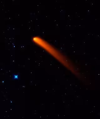 Una imagen muestra la belleza de un cometa llamado Siding Spring. En los desfiles del cometa hacia el sol, que arroja el polvo que brilla con luz infrarroja, visible a WISE. La cola del cometa, que se extiende alrededor de 10 millones de kilómetros, parece una raya de pintura roja. Una estrella brillante aparece a continuación en azul.