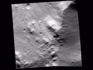 En esta imagen de alta resolución, la superficie muestra abundantes cráteres pequeños, y las texturas, tales como pequeños surcos, y alineamientos que recuerdan a las estructuras vistas en baja resolución desde las órbitas de mayor altitud. Además, esta escala en detalle pone de relieve pequeños afloramientos de material brillante y oscuro.