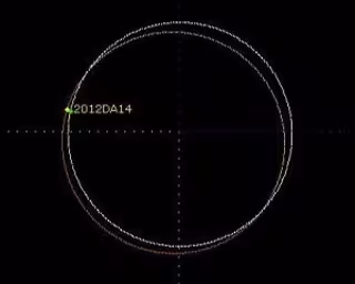 "Un cálculo de la órbita preliminar demuestra que el 2012 DA14 tiene un gran parecido a la órbita de la Tierra (se muestra en la imagen adjunta), con un período de 366.24 días, sólo un día más que nuestro año terrestre, saltando dos veces al año por encima de nuestra órbita", dice Nomen.