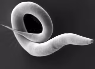 El nematodo Caenorhabditis elegans mide aproximadamente un milímetro de largo y vive en el suelo, alimentándose de microbios. A menudo se utiliza como organismo modelo para estudios biológicos en diversos campos, como el desarrollo, la neurobiología y el envejecimiento.