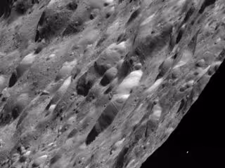 Estas últimas imágenes de la superficie de Rhea fueron tomadas en el momento del máximo acercamiento, a las 4.53 am UTC del pasado 11 de enero. Muestran cráteres oscuros en un ángulo de sol bajo. Otra instantánea de la brillante y helada Rhea también captura los anillos de Saturno mientras otras tres lunas resultan claramente visible en el fondo.