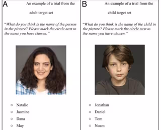 En otra parte del estudio, un sistema de aprendizaje automático se alimentó con una gran base de datos de imágenes de rostros humanos. El ordenador reconoció que las representaciones de los rostros de adultos con el mismo nombre eran significativamente más similares entre sí que las representaciones de los rostros de adultos con nombres diferentes. Por el contrario, no se encontró ninguna similitud significativa entre los niños con el mismo nombre en comparación con los niños con nombres diferentes.