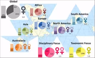 En la infografía de arriba, los gráficos circulares muestran la cantidad de hombres y mujeres en las juntas directivas de los comités científicos en diferentes regiones geográficas y el enfoque de la sociedad (es decir, disciplinario o taxonómico). Los colores más oscuros denotan a las mujeres, y los claros a los hombres. Los gráficos de barras muestran la proporción de sociedades que tienen declaraciones de diversidad (al porcentaje más cercano). Los símbolos femeninos representan el recuento promedio del número de mujeres que cumplen funciones de liderazgo dentro de una sociedad (presidente, vicepresidente, secretario, tesorero) con el decimal más cercano. Por ejemplo, en Asia: el 19% de las sociedades tienen declaraciones de diversidad, 358 posiciones en el consejo son ocupadas por hombres y 103 por mujeres, y el número promedio de mujeres en posiciones directivas es de 0,7 (de cuatro puestos posibles).