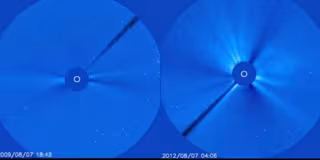 El aumento bastante dramático en la actividad solar desde 2009 hasta el presente es fácil de ver en una comparación lado a lado desde entonces y ahora tomada por el instrumento LASCO a bordo del Observatorio Solar y Heliosférico (SOHO).