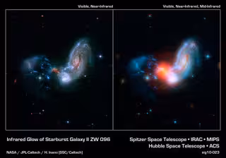 "Este descubrimiento demuestra que la fusión de galaxias puede generar destellos de gran alcance fuera de los centros de las galaxias padres", dice Hanae Inami, primer autor de un estudio que detalla los resultados en The Astronomical Journal. Inami, estudiante graduado en la Universidad de Postgrado para Estudios Avanzados en Japón y el Centro de Ciencia Spitzer en el Instituto de Tecnología de California, agrega: "La emisión de luz infrarroja de la erupción domina su galaxia anfitriona y rivaliza con el de las galaxias más luminosas que vemos que están relativamente cerca de nuestra casa, la Vía Láctea".