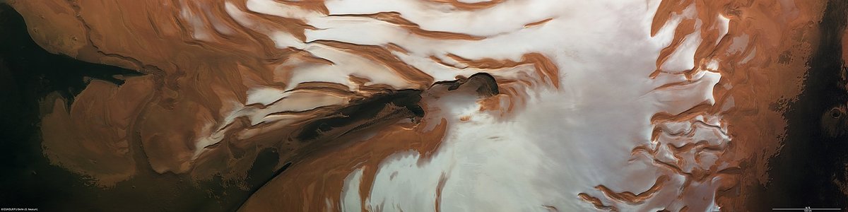 El escudo de hielo está cubierto por agua congelada y hielo de dióxido de carbono en invierno y primavera, pero en este punto en el año marciano todo el hielo de dióxido de carbono se ha calentado y evaporado en la atmósfera del planeta.