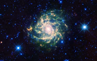 En una galaxia en espiral como IC 342, el polvo y el gas se concentran en sus brazos. Las bolsas más densas de gas desencadenan la formación de nuevas estrellas, como se representa en verde y amarillo. El núcleo, que se muestra en rojo, también está lleno de estrellas jóvenes, que están calentando el polvo. Las estrellas que aparecen en azul residen en nuestra Vía Láctea, entre nosotros y la IC 342.