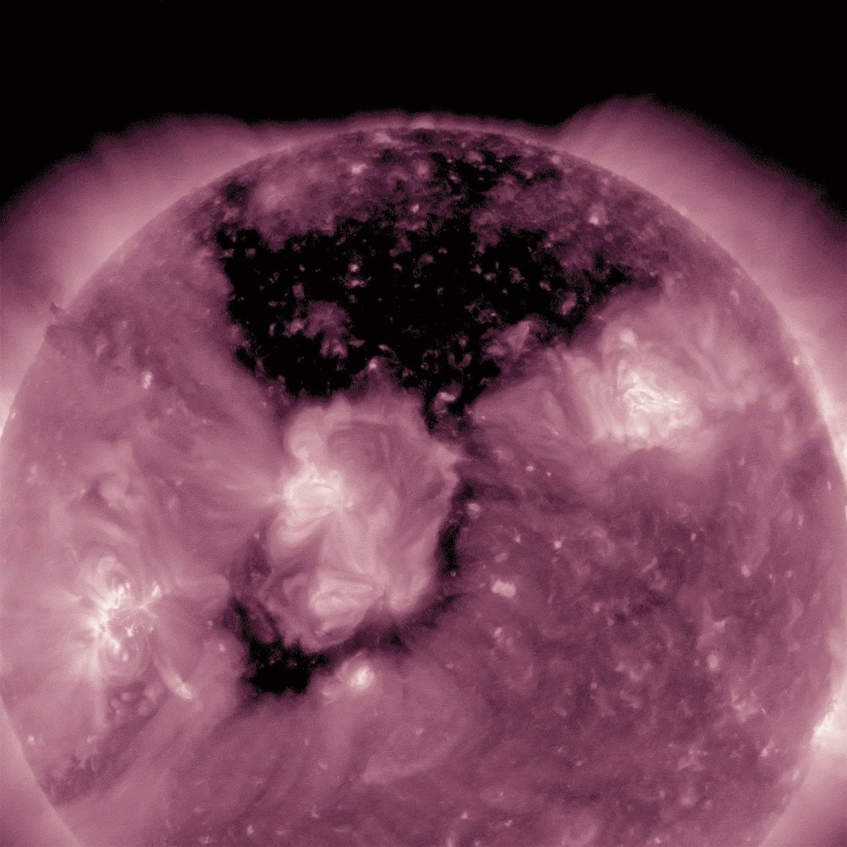 Los agujeros de la corona son regiones de baja densidad de la atmósfera del Sol, conocida como corona. Como contienen poco material solar, tienen una temperatura más baja y se muestran mucho más oscuras que su entorno. Los agujeros de la corona son visibles en algunos tipos de luz ultravioleta extrema, que es invisible a nuestros ojos, y que aquí está coloreado en púrpura para facilitar la visualización.
