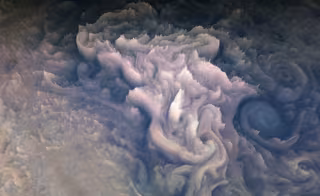 Las animaciones de las alturas relativas de las cimas de las nubes de Júpiter revelan remolinos y picos de textura delicada que se asemejan al glaseado en la parte superior de una magdalena.