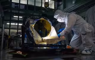 El prototipo del telescopio LISA se somete a una inspección posterior a la entrega en una sala limpia oscura del Goddard de la NASA el 20 de mayo. - NASA/DENNIS HENRY
