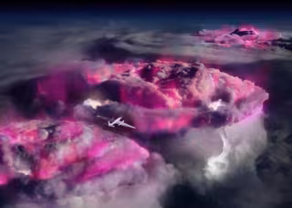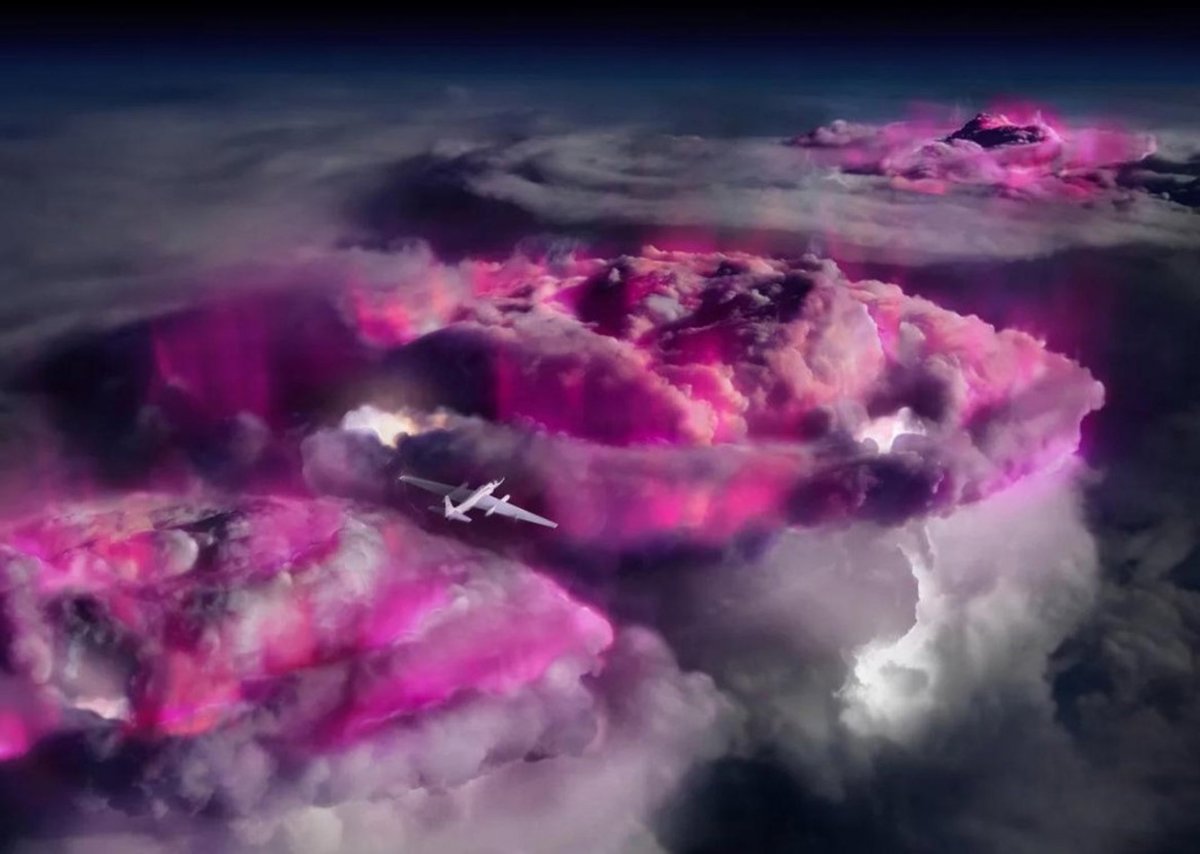 En esta impresión artística, un avión espía de la NASA que vuela a gran altitud lleva instrumentación para registrar destellos de rayos gamma terrestres de color púrpura en las nubes de tormenta. - NASA/ALOFT