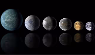 Concepción artística de una alineación planetaria que muestra exoplanetas en zonas habitables con similitudes con la Tierra, que se muestran en el extremo derecho. - NASA/AMES/JPL-CALTECH